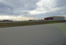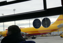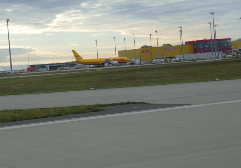 auf den beheizten Bus, mit dem wir nun eine Rundfahrt über den Flugplatz machen, wir sehen das riesige DHL Frachtzentrum, das Amazon Verteilzentrum
