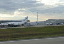 sehen wir es, ein riesiges Flugzeug. Die wahre Größe erschliest sich erst bei einem Rundgang um das Flugzeug - eine riesige Heckklappe, einem