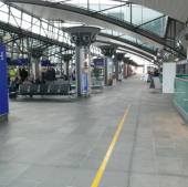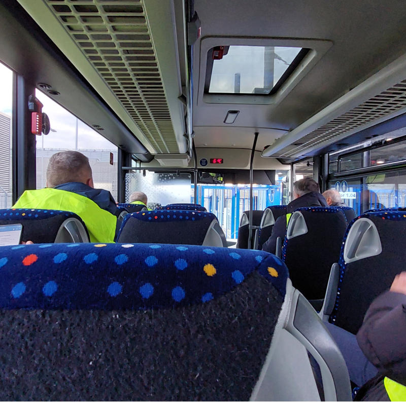 auf den beheizten Bus, mit dem wir nun eine Rundfahrt über den Flugplatz machen, wir sehen das riesige DHL Frachtzentrum, das Amazon Verteilzentrum